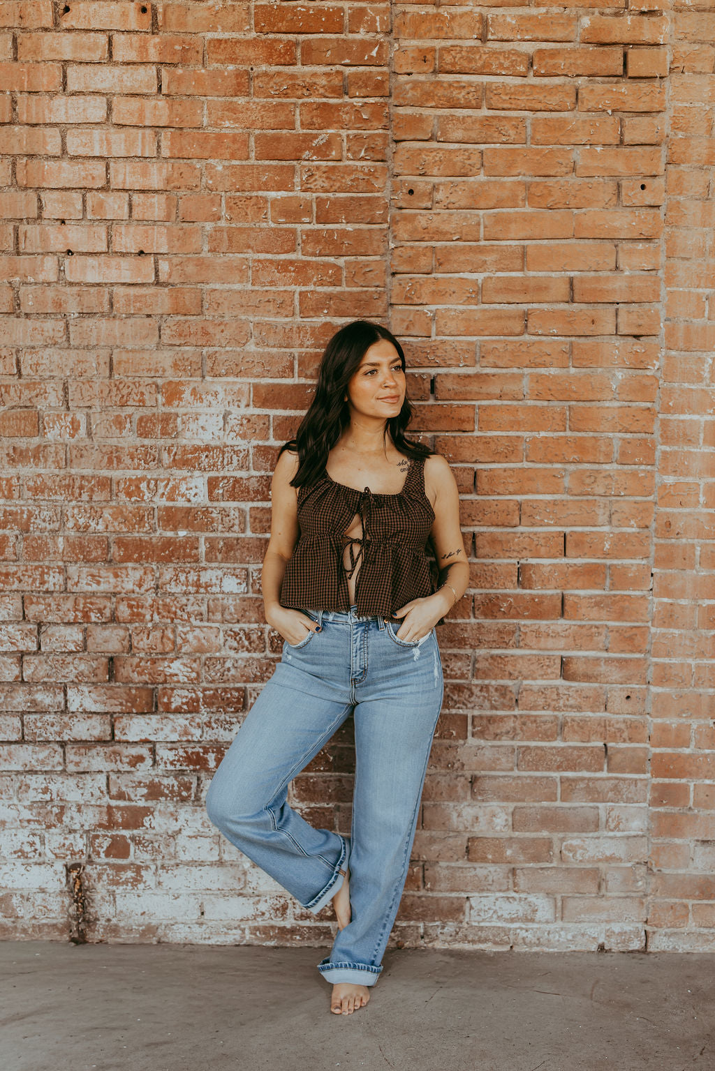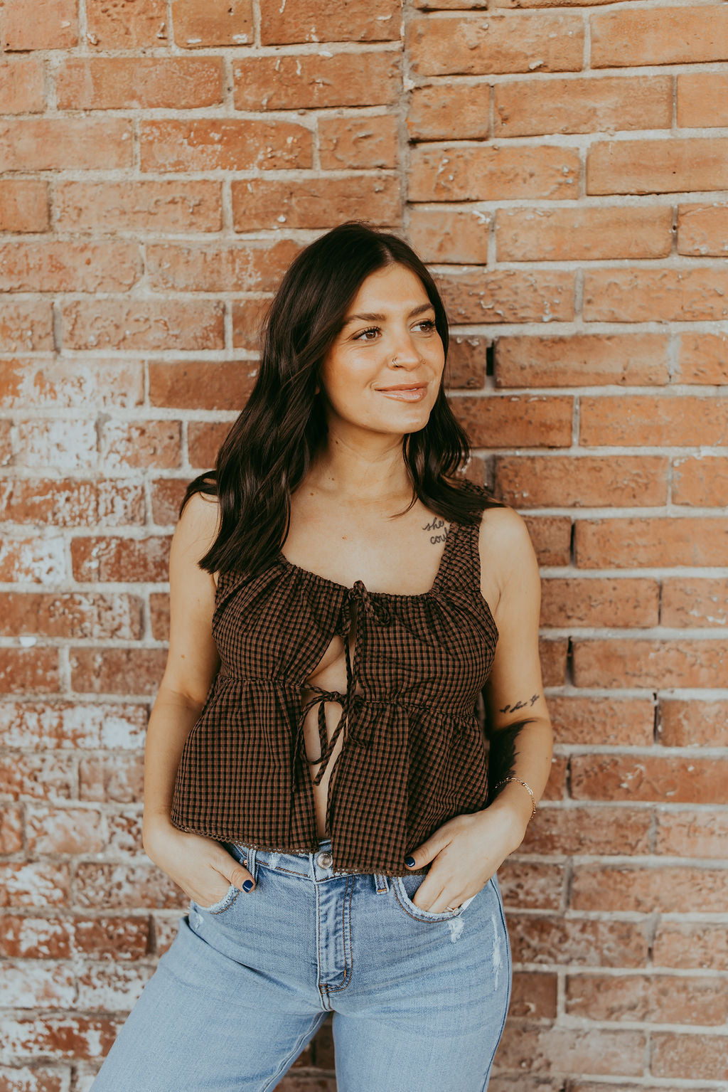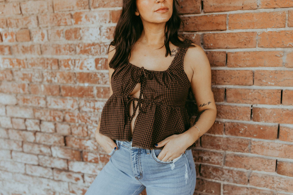 Feminine and flattering, this tie-front sleeveless peplum top features a soft, flowy silhouette with a cinched waist for a graceful shape. The front tie detail adds a charming touch, while the sleeveless design keeps it cool and comfortable. Perfect for pairing with jeans, skirts, or shorts for an effortlessly chic look.